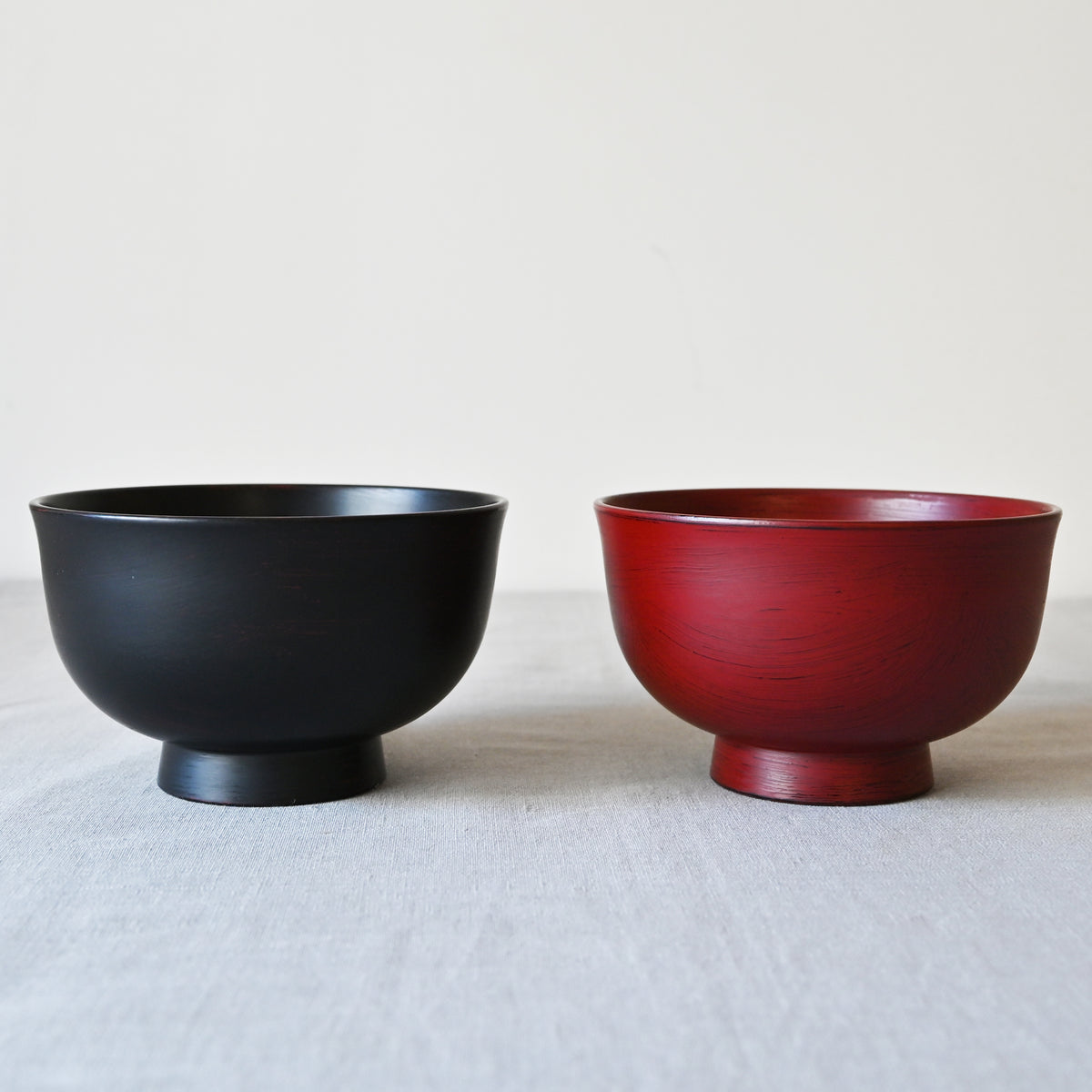 使っていくと朱漆が磨り減り黒の部分が多くなる根来塗り。根来寺の塗りものに由来するといわれています。