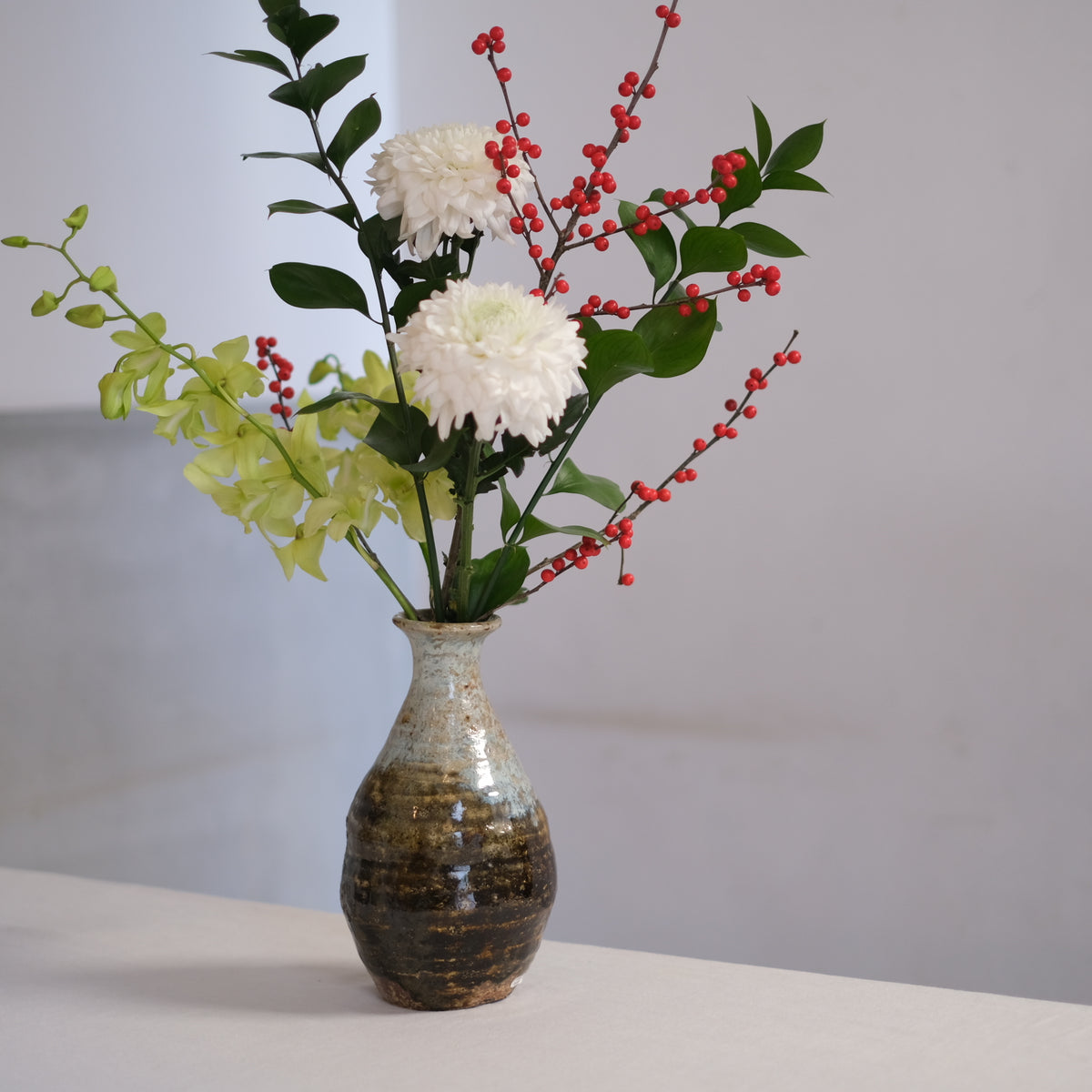 紫陽花や蘭の花を生けて窓際や飾り棚に。梅や桜の枝ものを生けても。
