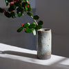 大らかな土の中に優しく滲む水色が水辺のような風合いを感じさせる斑花入。