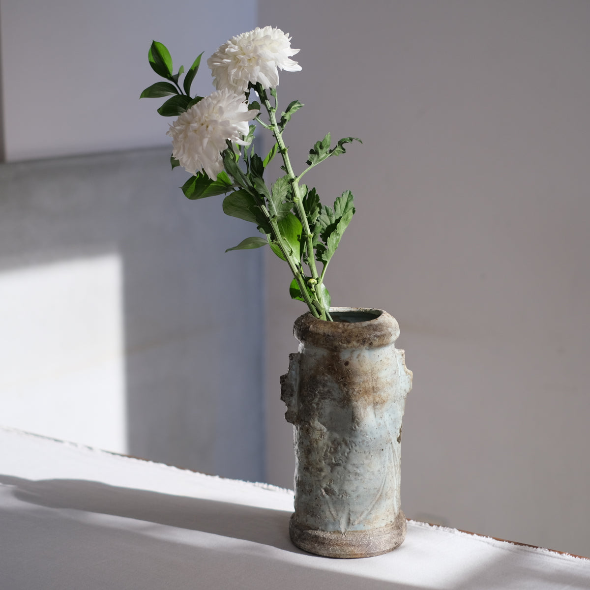 灰をはぶった景色に趣を感じる花入れ。
