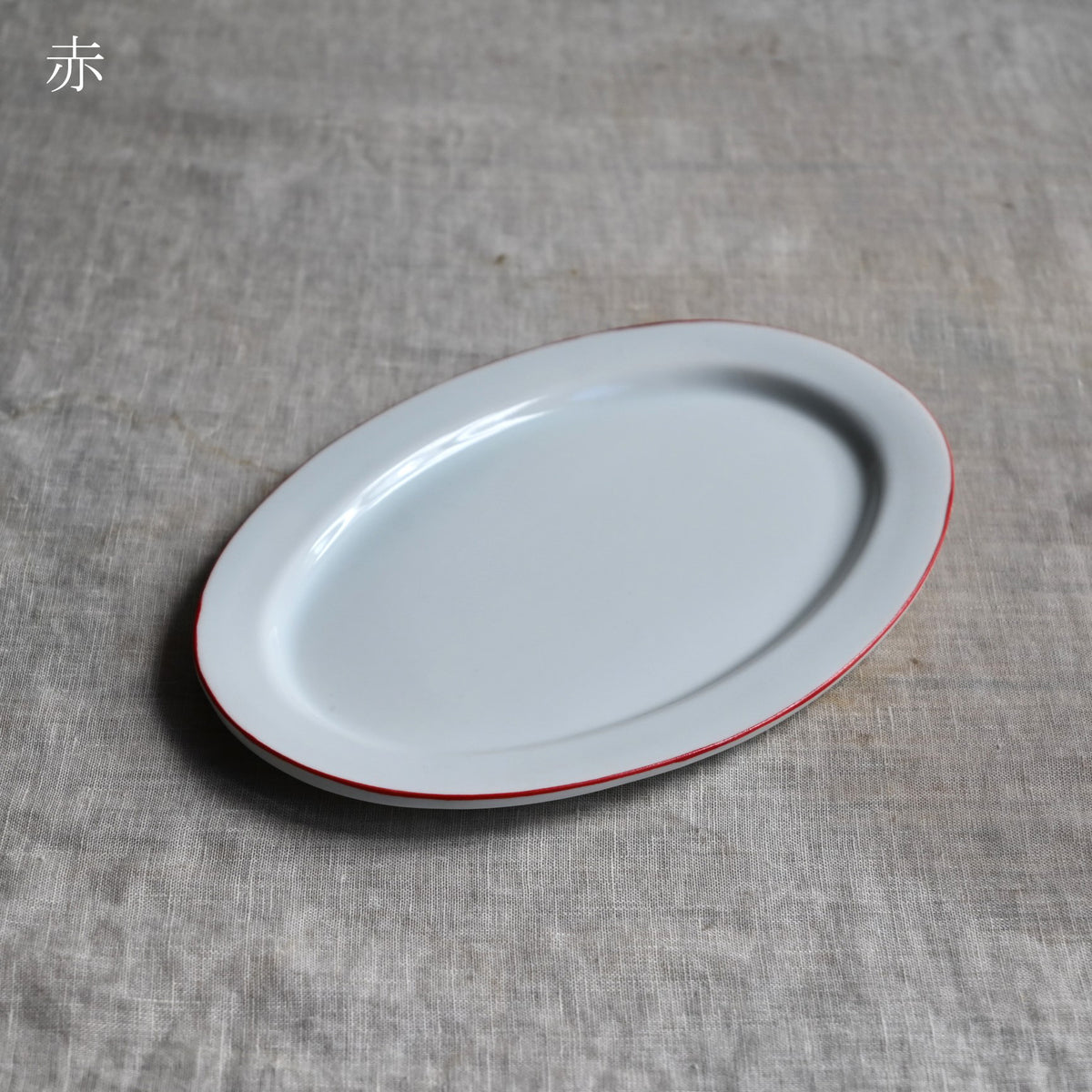 静岡県で制作される赤堀さん。琺瑯のような質感に、さりげないふちどりの色がアクセントに。懐かしさもありながら、すっきりとしたかたちは洗練された雰囲気。日々の食卓に新しい風を吹かせてくれるような器です。