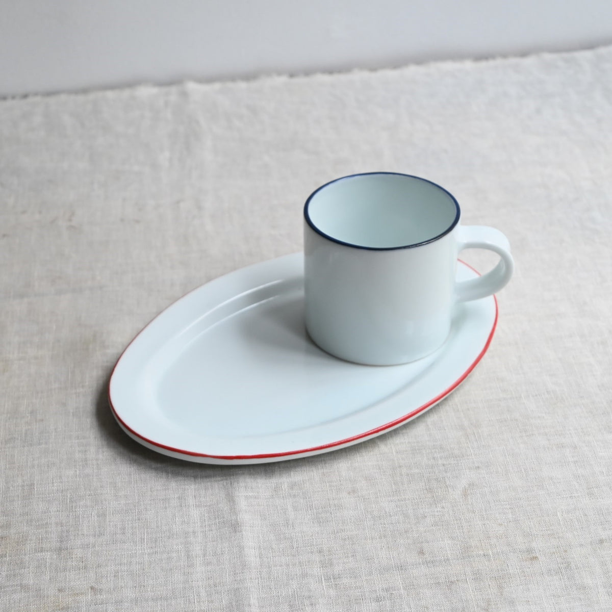 静岡県で制作される赤堀さん。琺瑯のような質感に、さりげないふちどりの色がアクセントに。懐かしさもありながら、すっきりとしたかたちは洗練された雰囲気。日々の食卓に新しい風を吹かせてくれるような器です。
