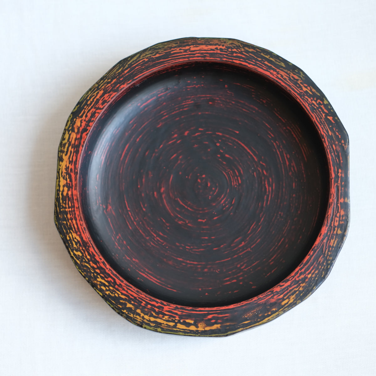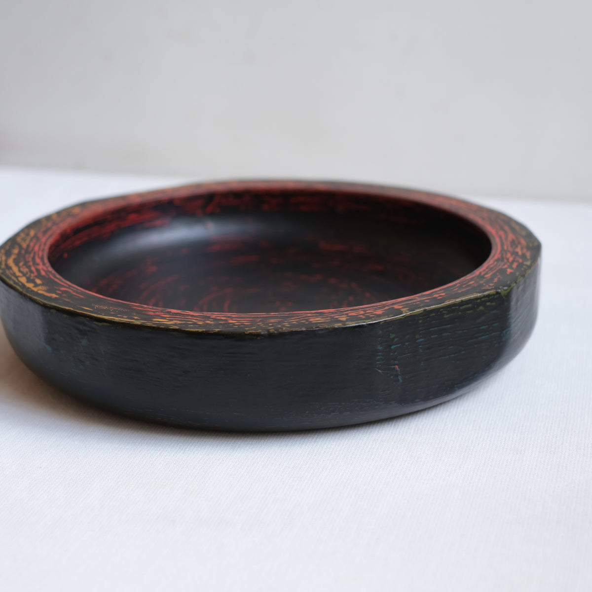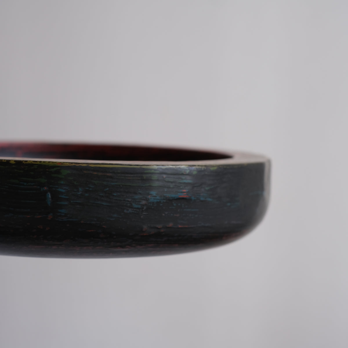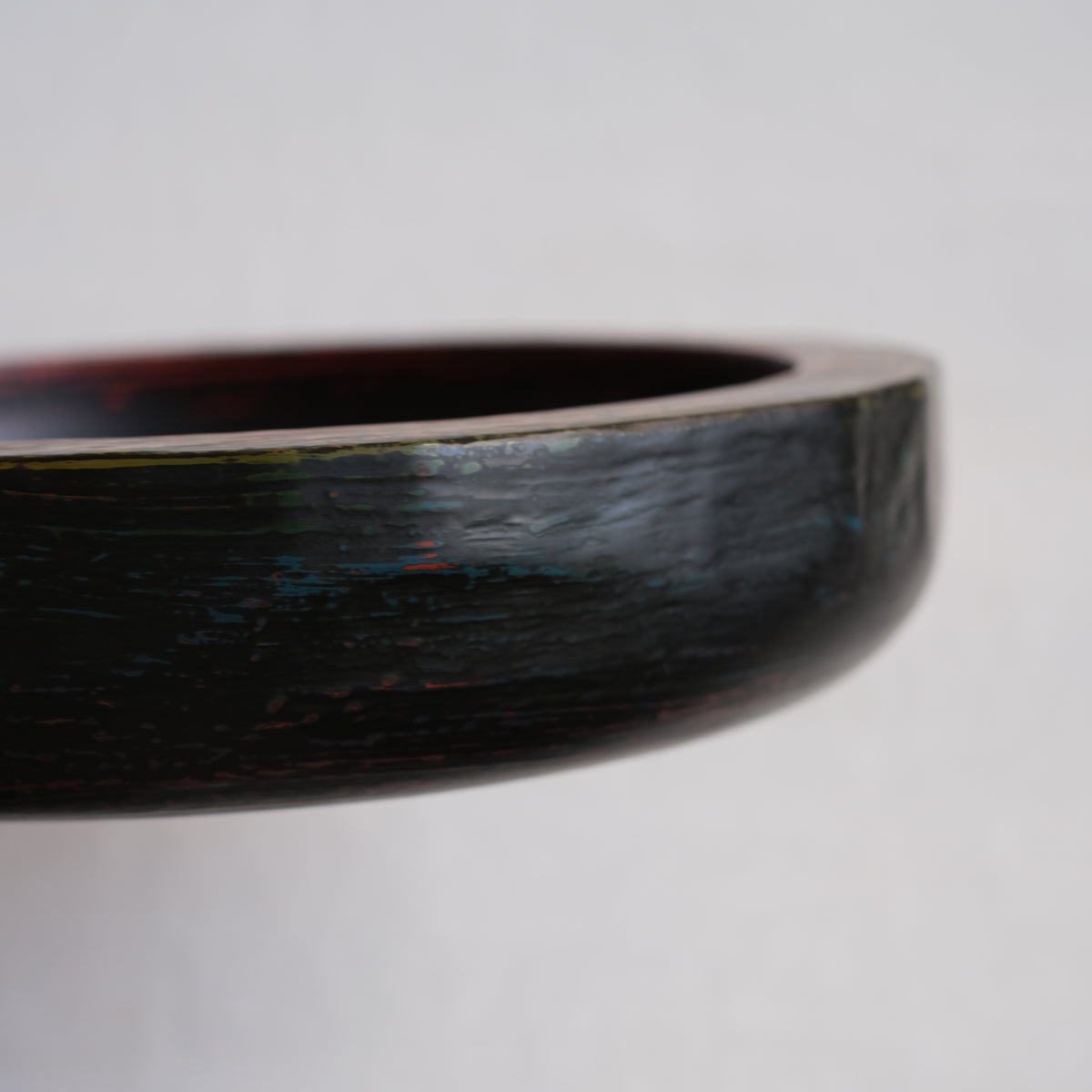 下地の赤、青、黄色、緑が削り出され漆器には珍しいカラフルな、それでいてずっしりと落ち着いた重厚感があります。