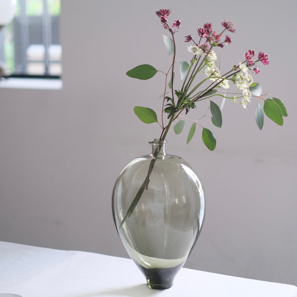 大阪堺市生まれ。現在は石川県能登島で制作されています。有永さんの工房で調合されたガラスは角度により青みや紫を感じ自然光と照明、飲み物の色によっても変化し瞬間の美しさに魅了されます。