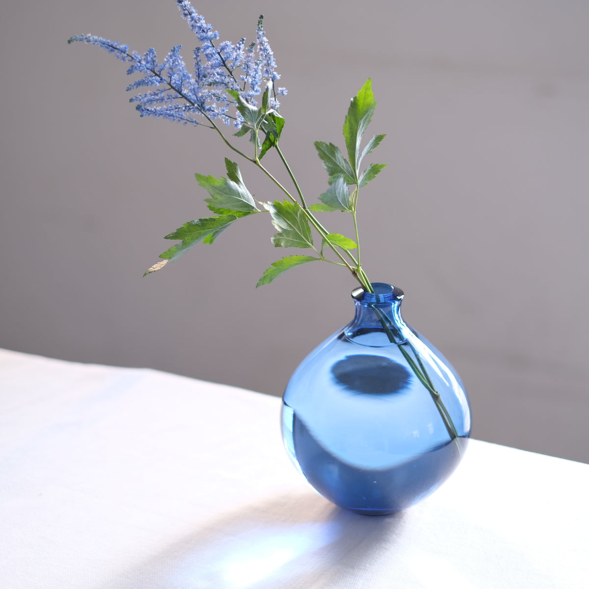 大阪堺市生まれ。現在は石川県能登島で制作されています。有永さんの工房で調合されたガラスは角度により青みや紫を感じ自然光と照明、飲み物の色によっても変化し瞬間の美しさに魅了されます。