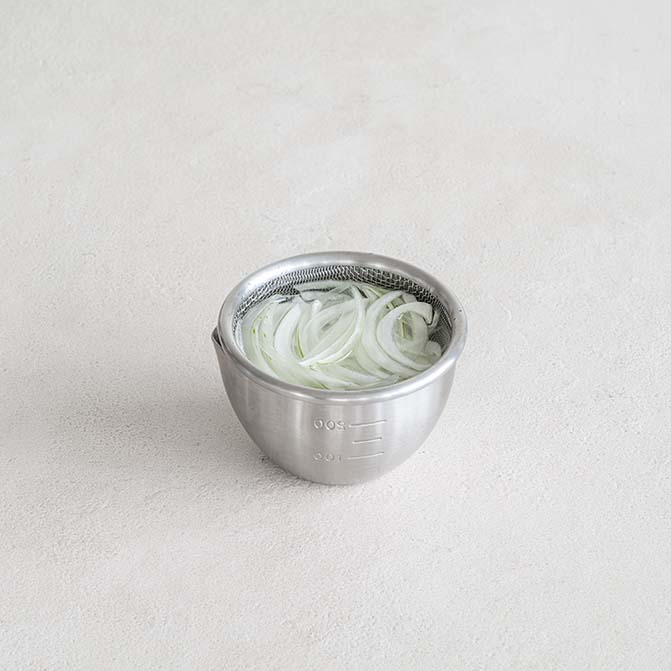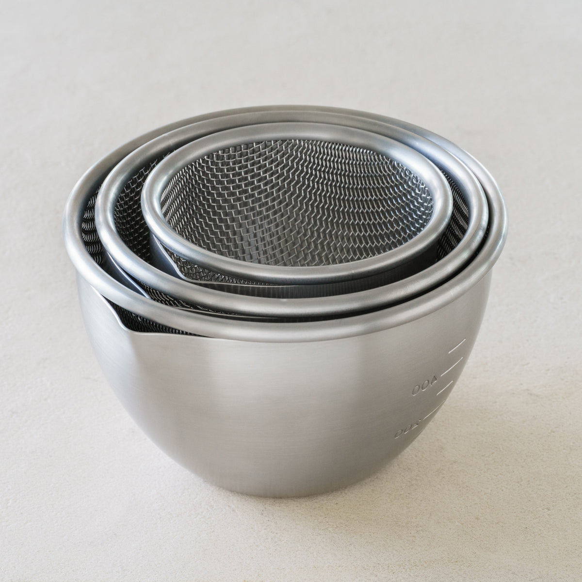 下ごしらえボウルと合わせれば、水にさらした後の食材の水切りや湯切り、卵や粉ものを漉すときにも使えます。