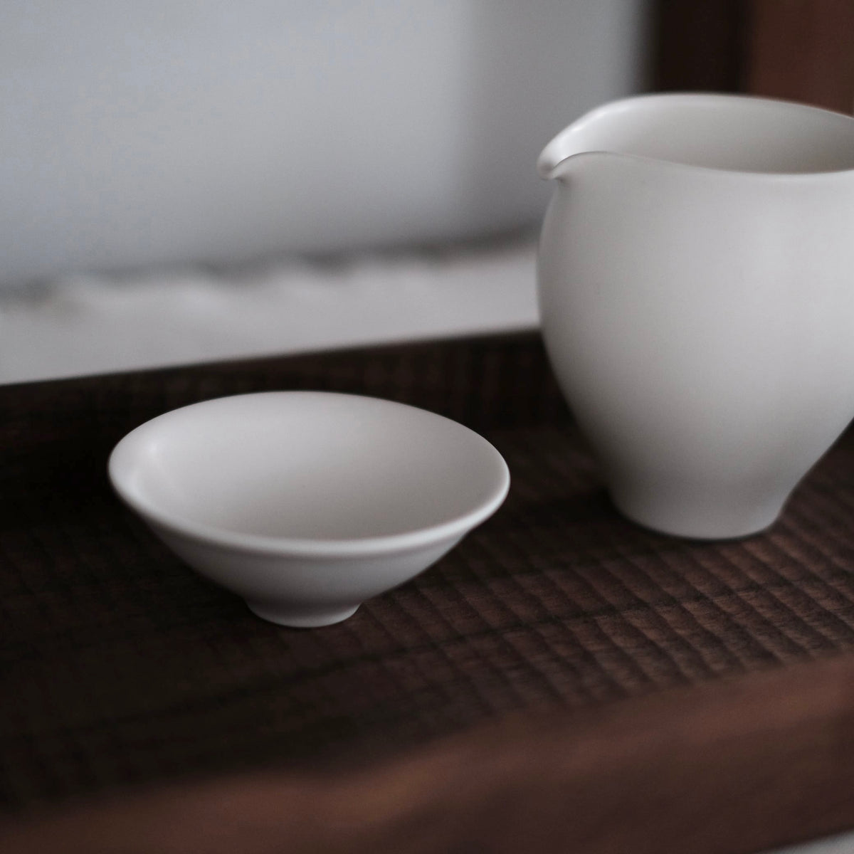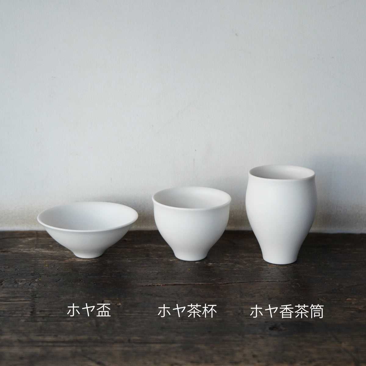 水切れのよい注器や、口当たりの心地よいカップなど、ほんのりマットでなめらかな白い器。曲線が美しく、愛らしい形で、お茶や食べ物の色を美しく引き出してくれます。