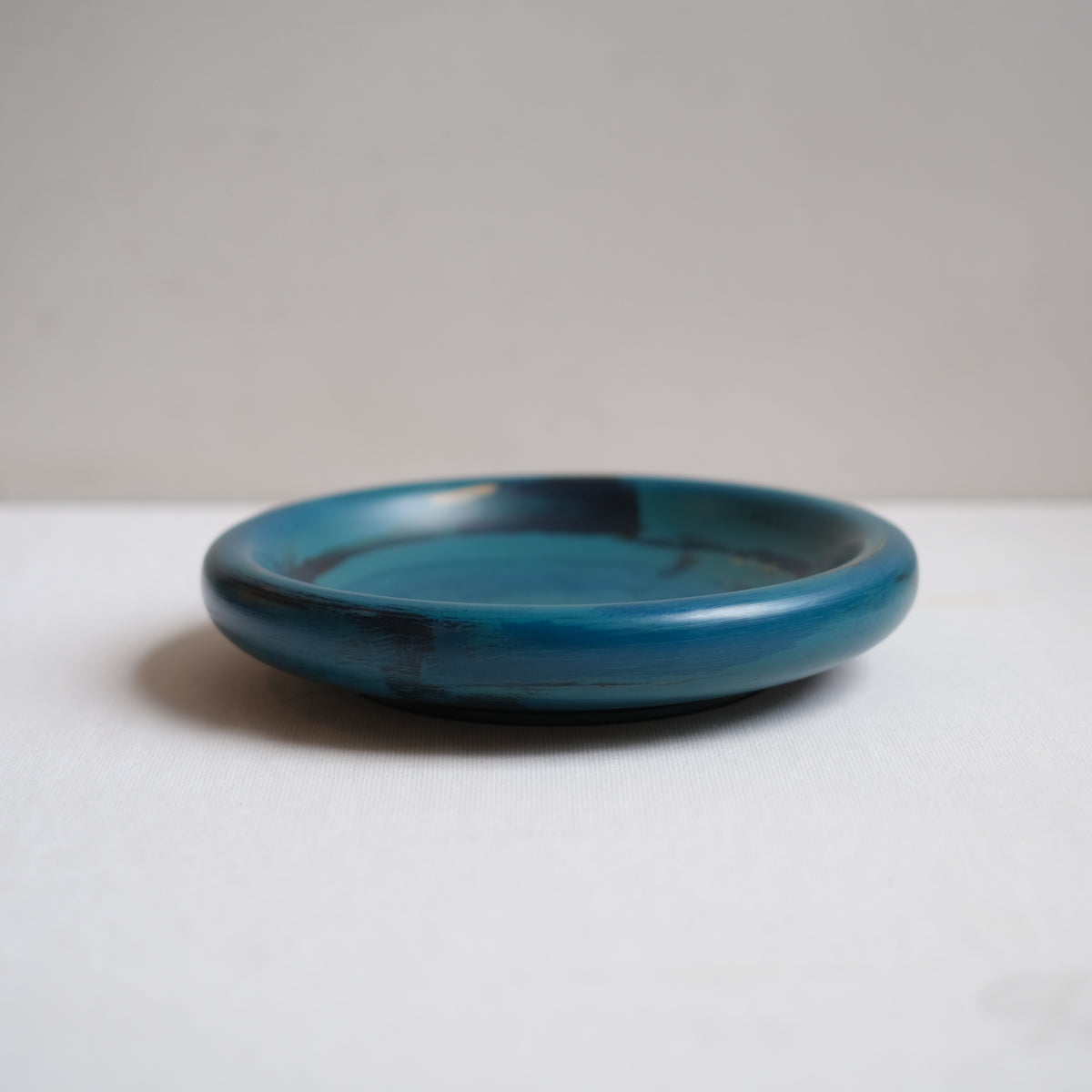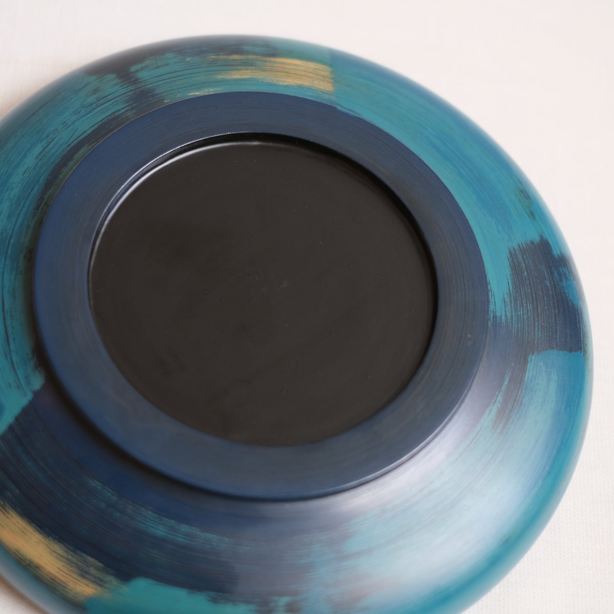 下地の黒の上に青を重ねた華やかな作品。ずっしり重厚感がありかっこいいです。パスタやカレー、サラダなど深さもあり使いやすいサイズ感。