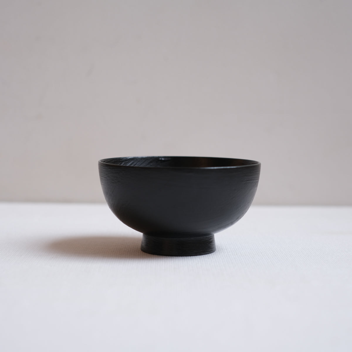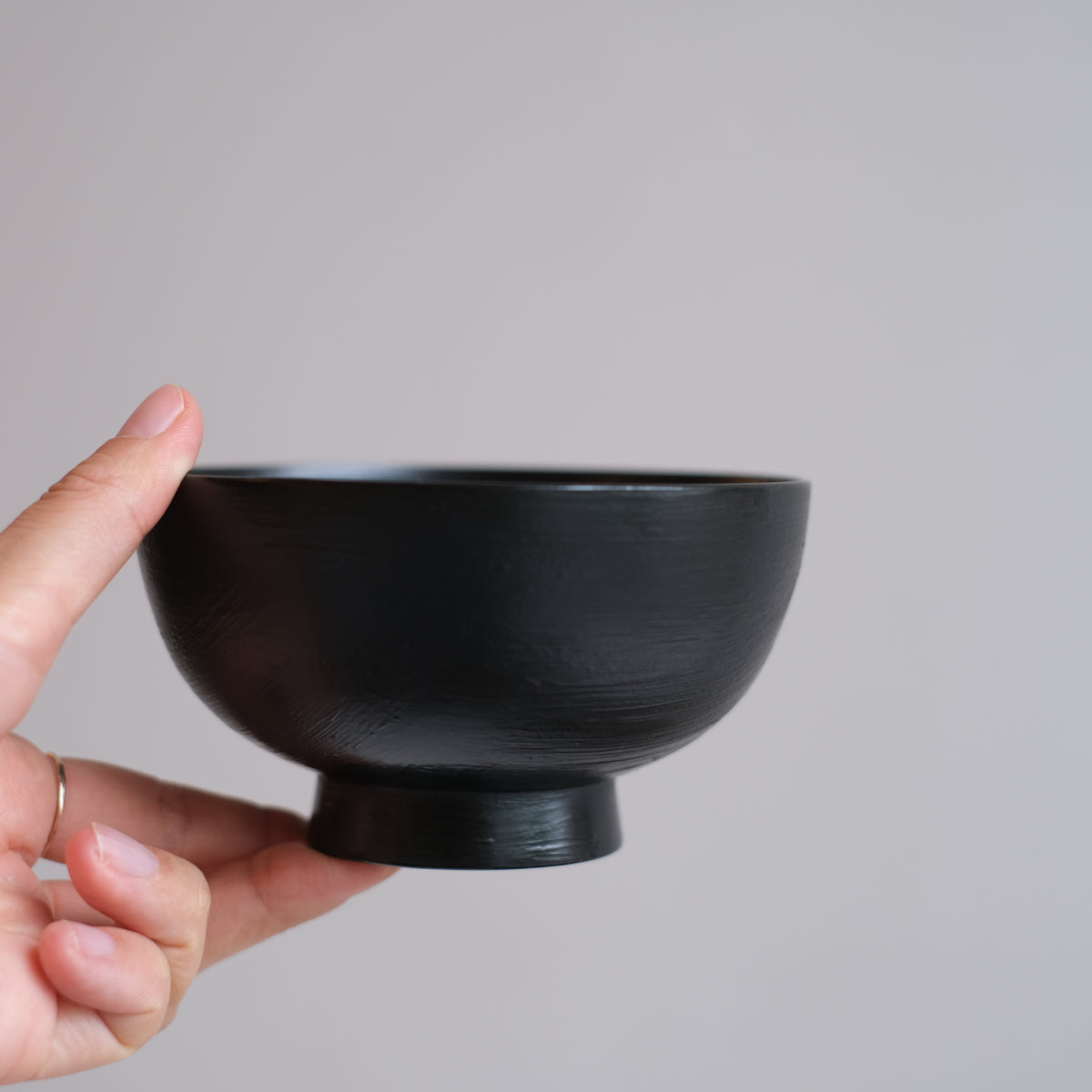 素地:ケヤキの木をくり抜き、漆塗りした作品です。しっかりした木地の厚さがあるので、熱い汁物を入れても、熱さを気にせずに手に持つことができます。