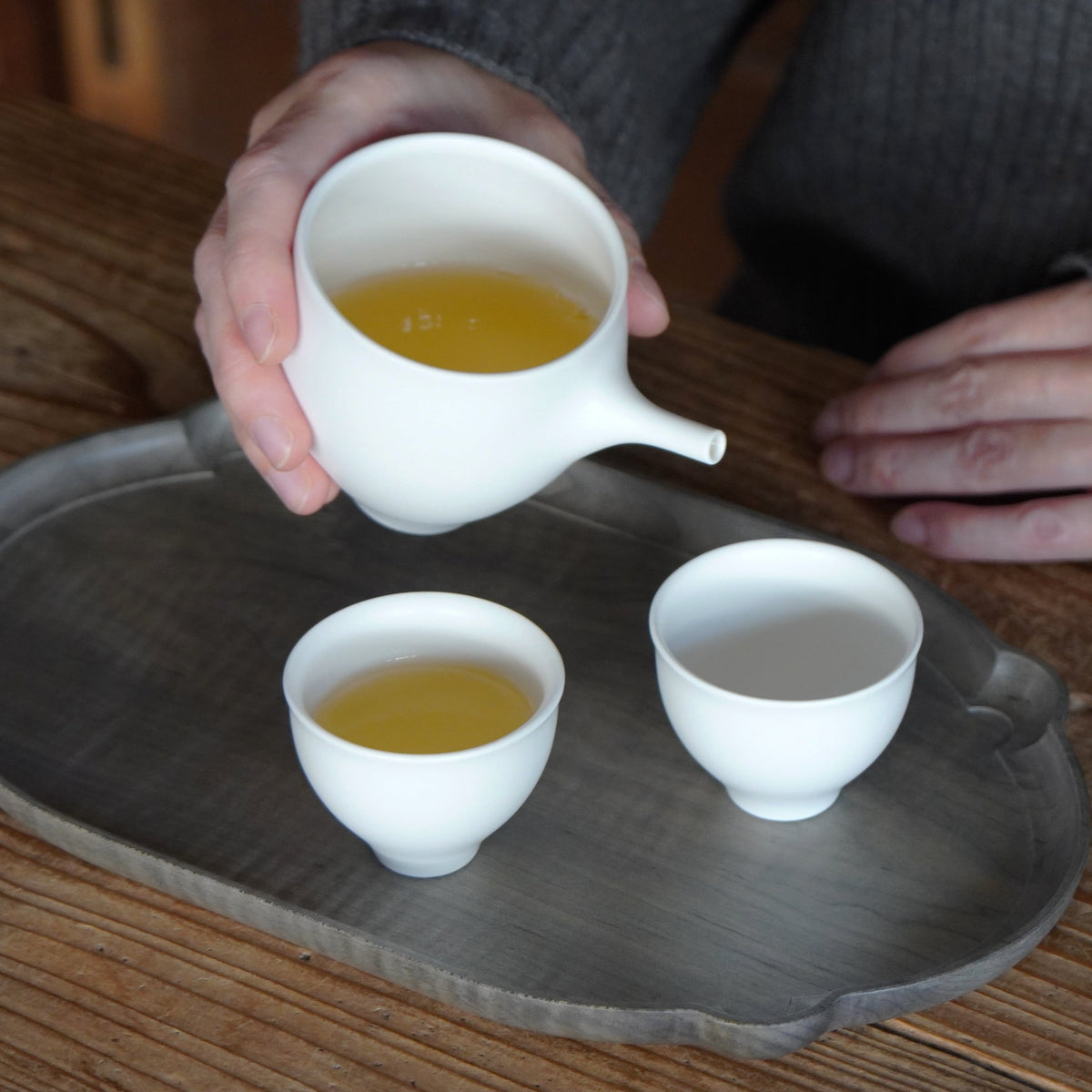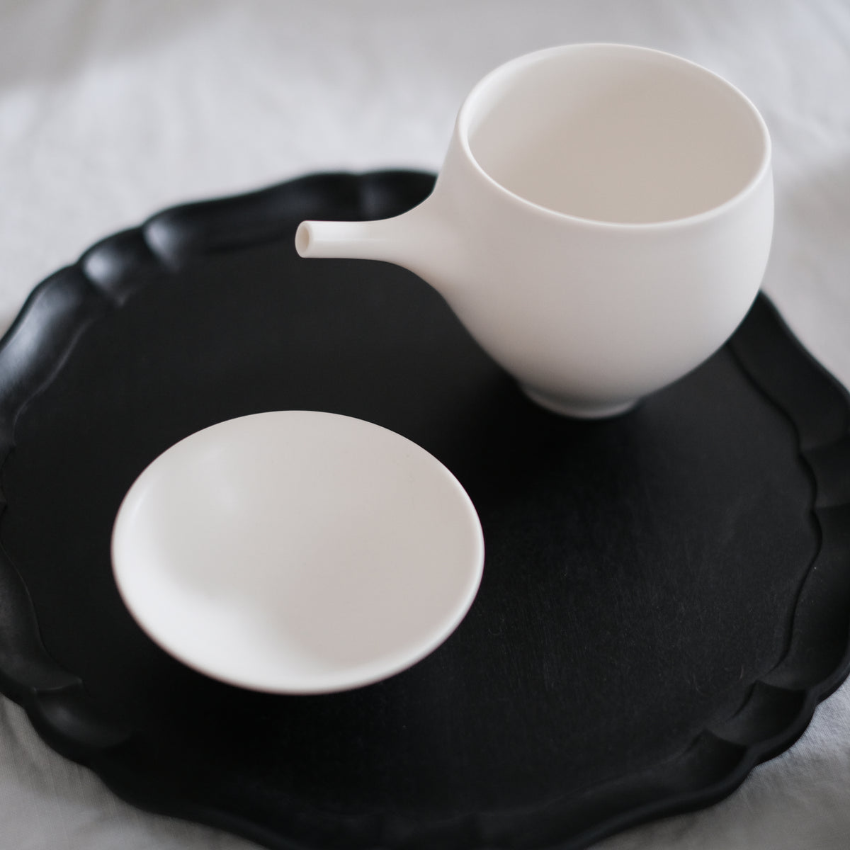 水切れのよい注器や、口当たりの心地よいカップなど、ほんのりマットでなめらかな白い器。曲線が美しく、愛らしい形で、お茶や食べ物の色を美しく引き出してくれます。