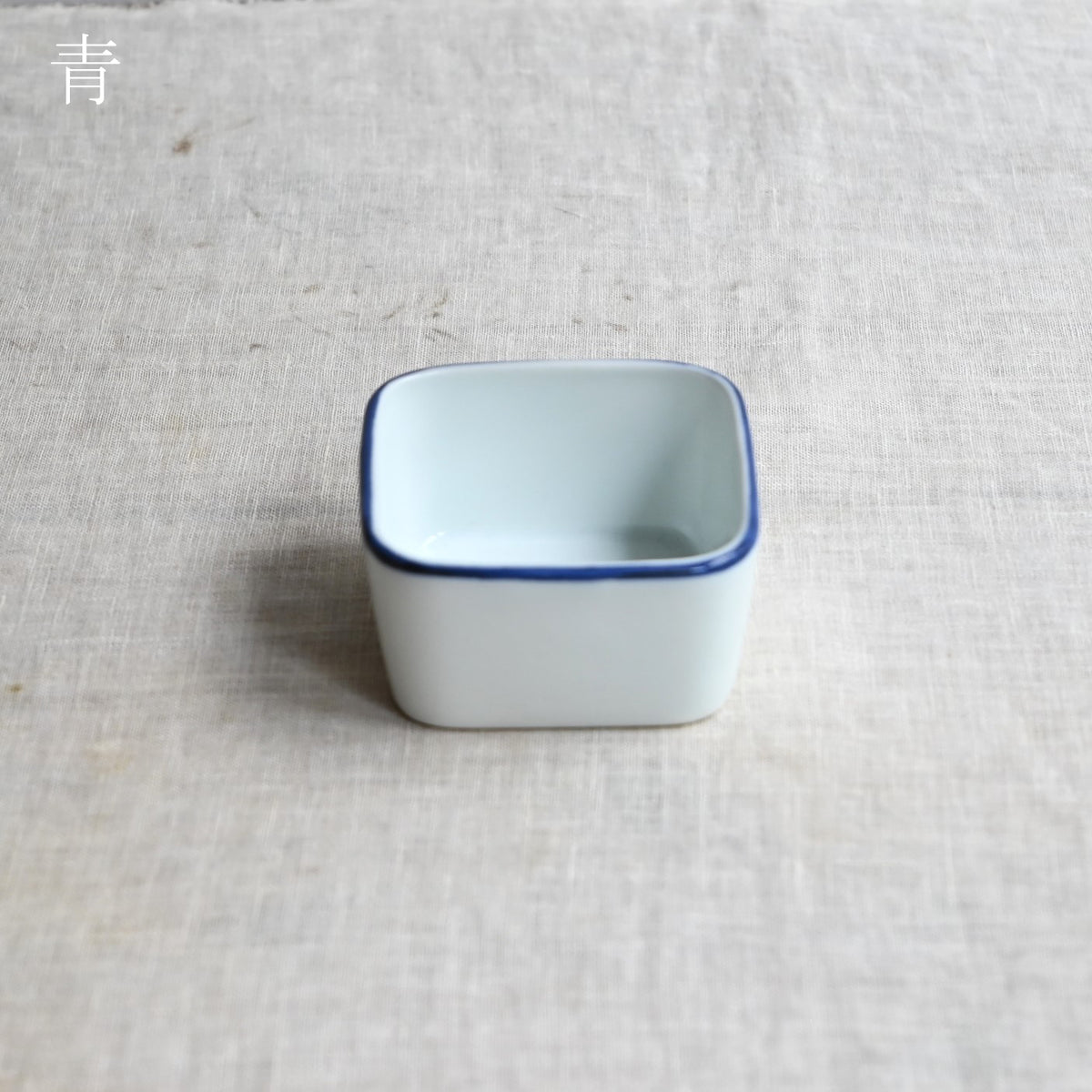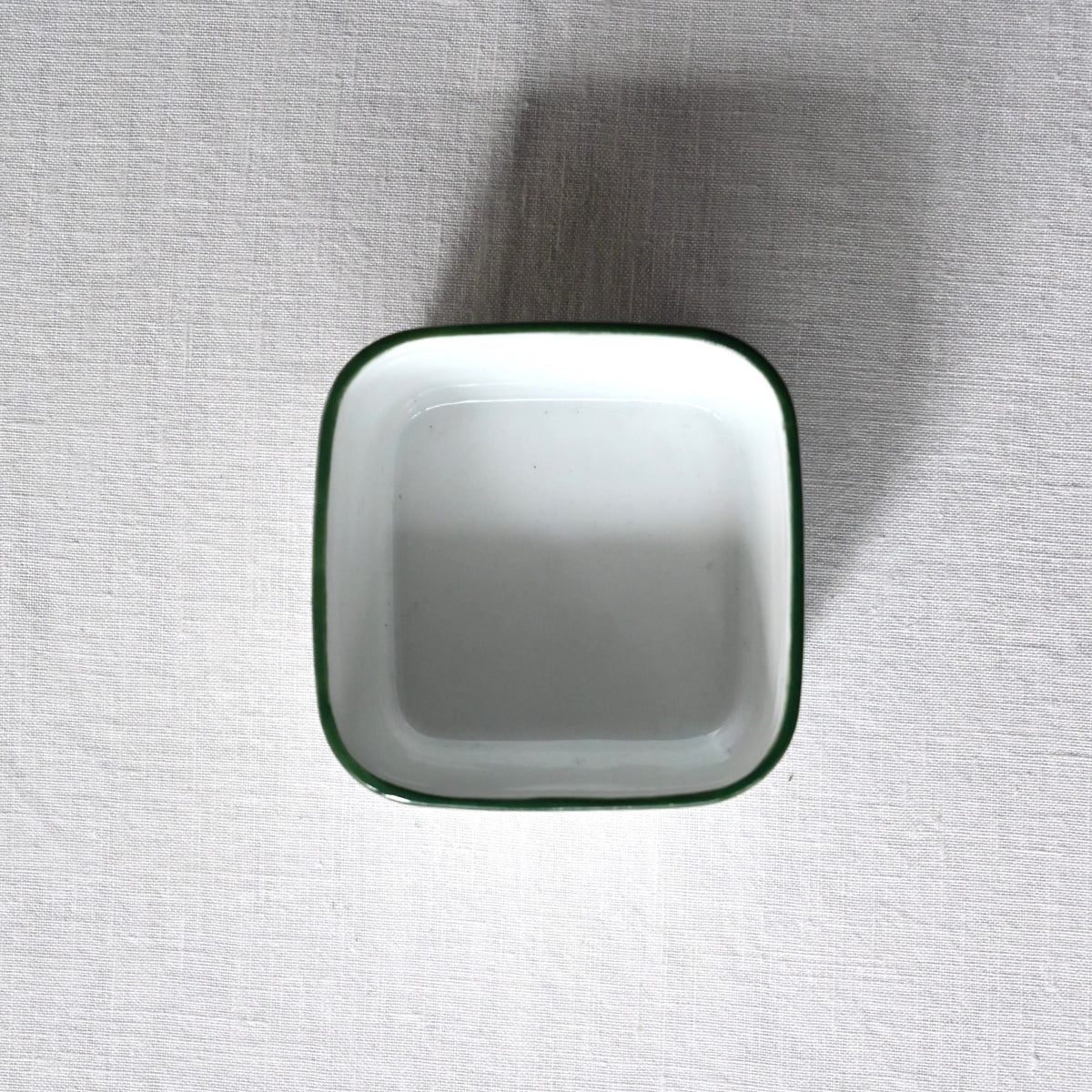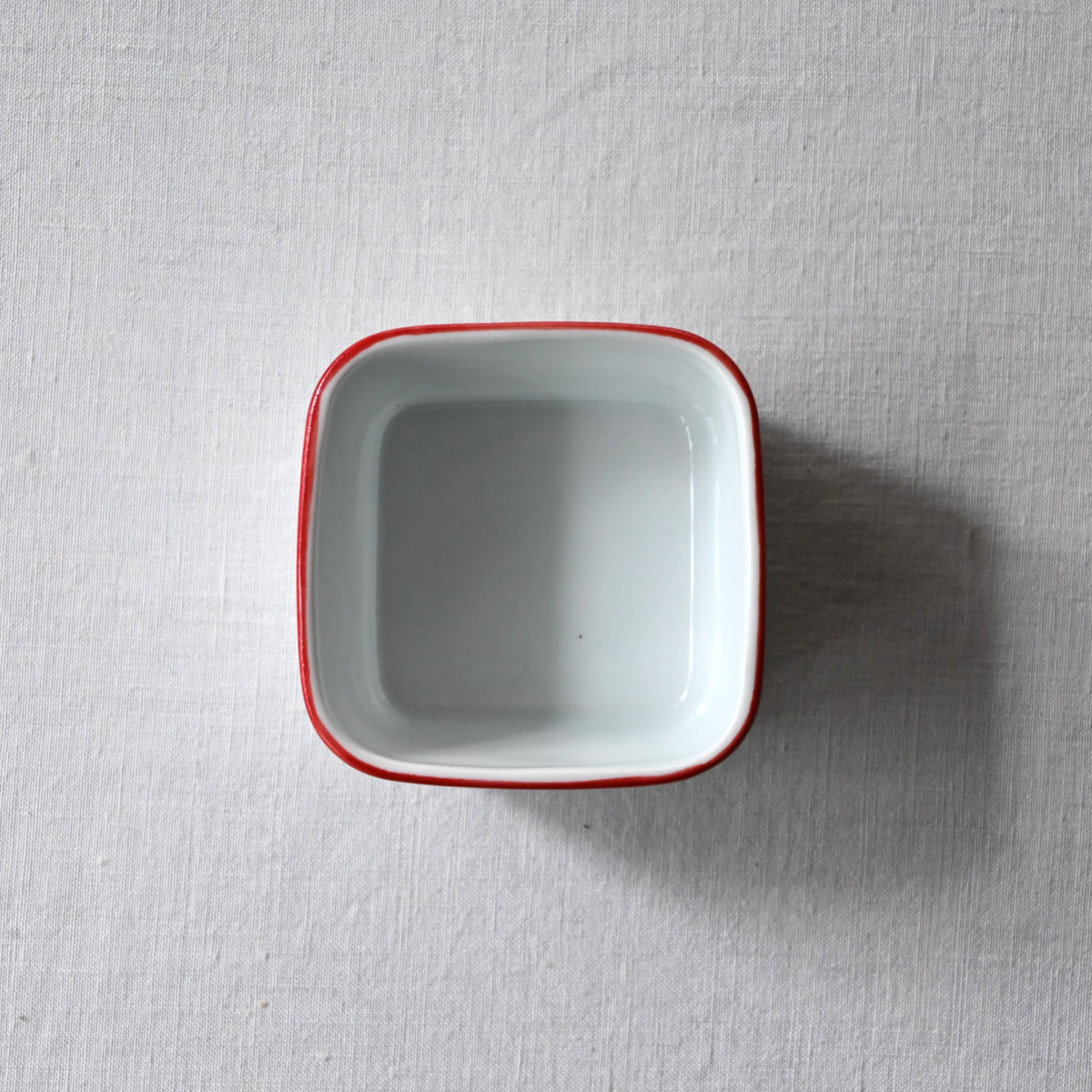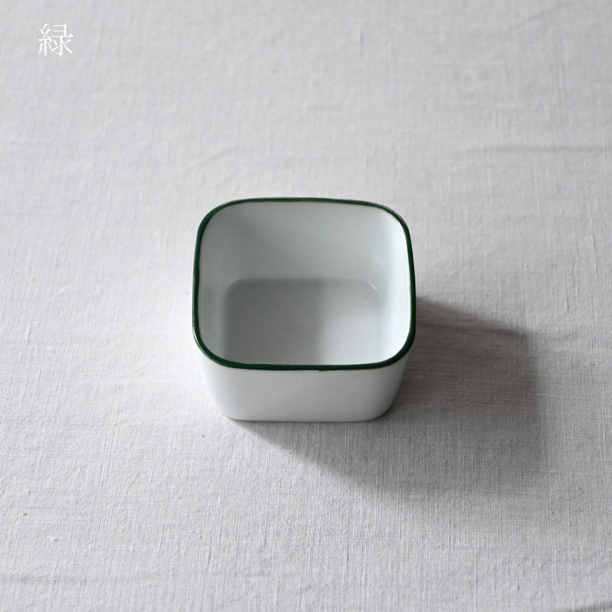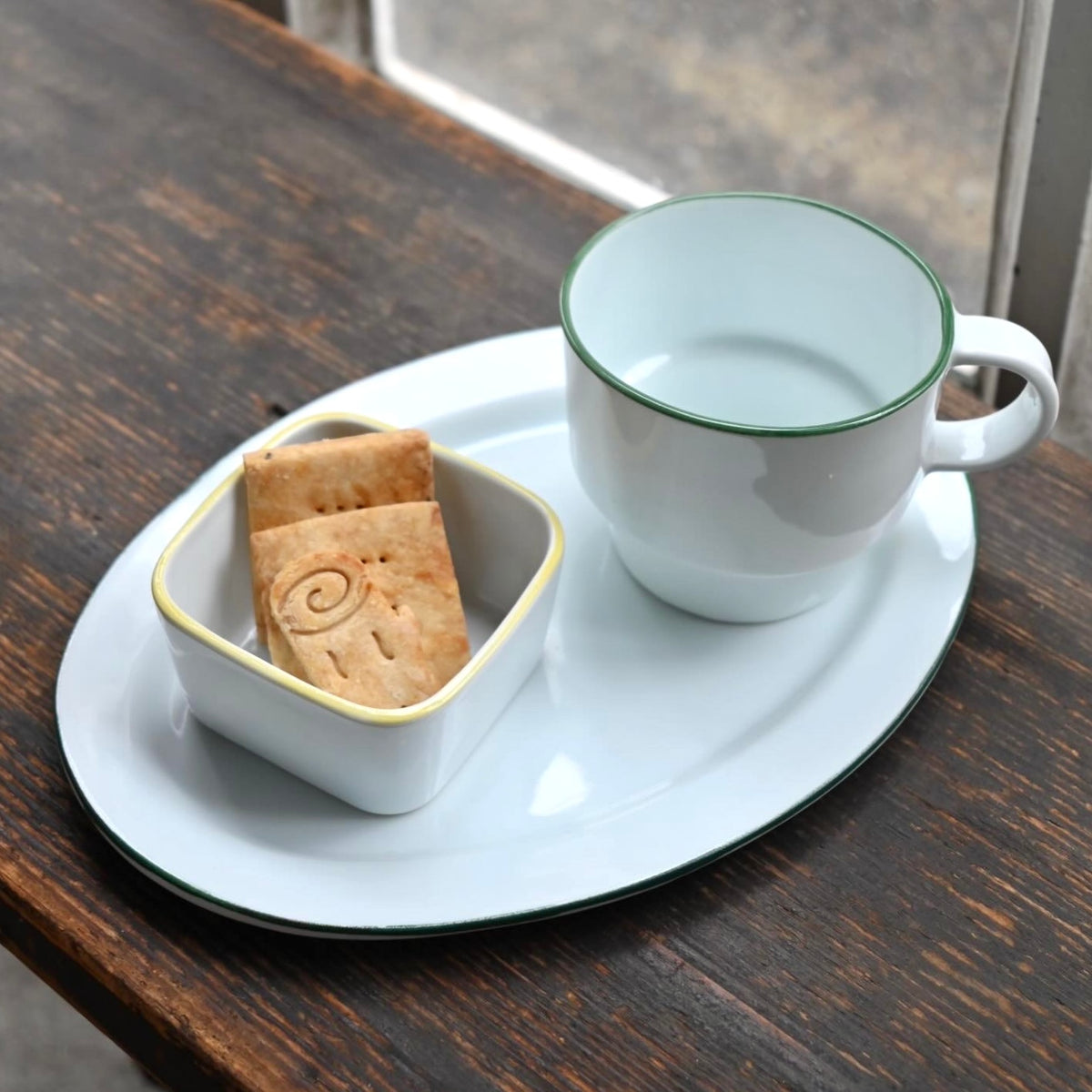 静岡県で制作される赤堀さん。琺瑯のような質感に、さりげないふちどりの色がアクセントに。懐かしさもありながら、すっきりとしたかたちは洗練された雰囲気。日々の食卓に新しい風を吹かせてくれるような器です。