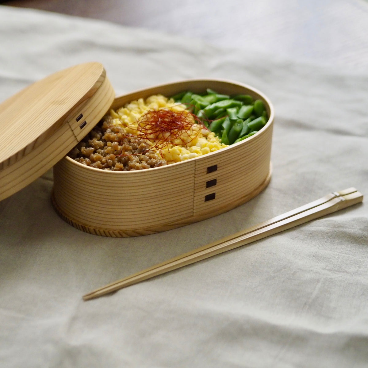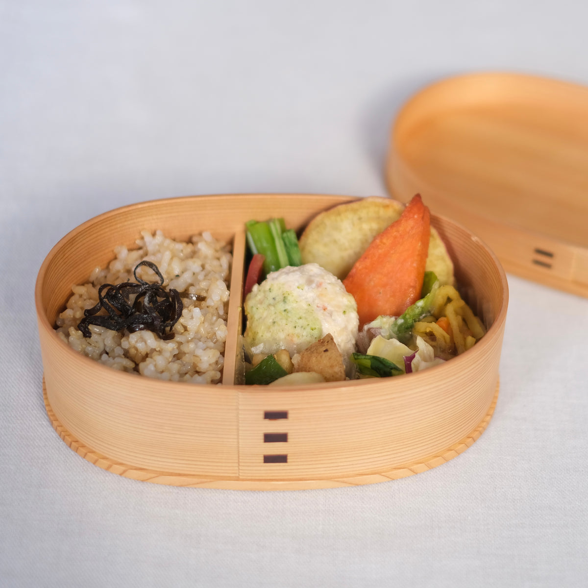 曲げわっぱはご飯の粗熱を取り余分な湿気を吸収して時間が経ってもお米をほどよい柔らかさに保ってくれます。