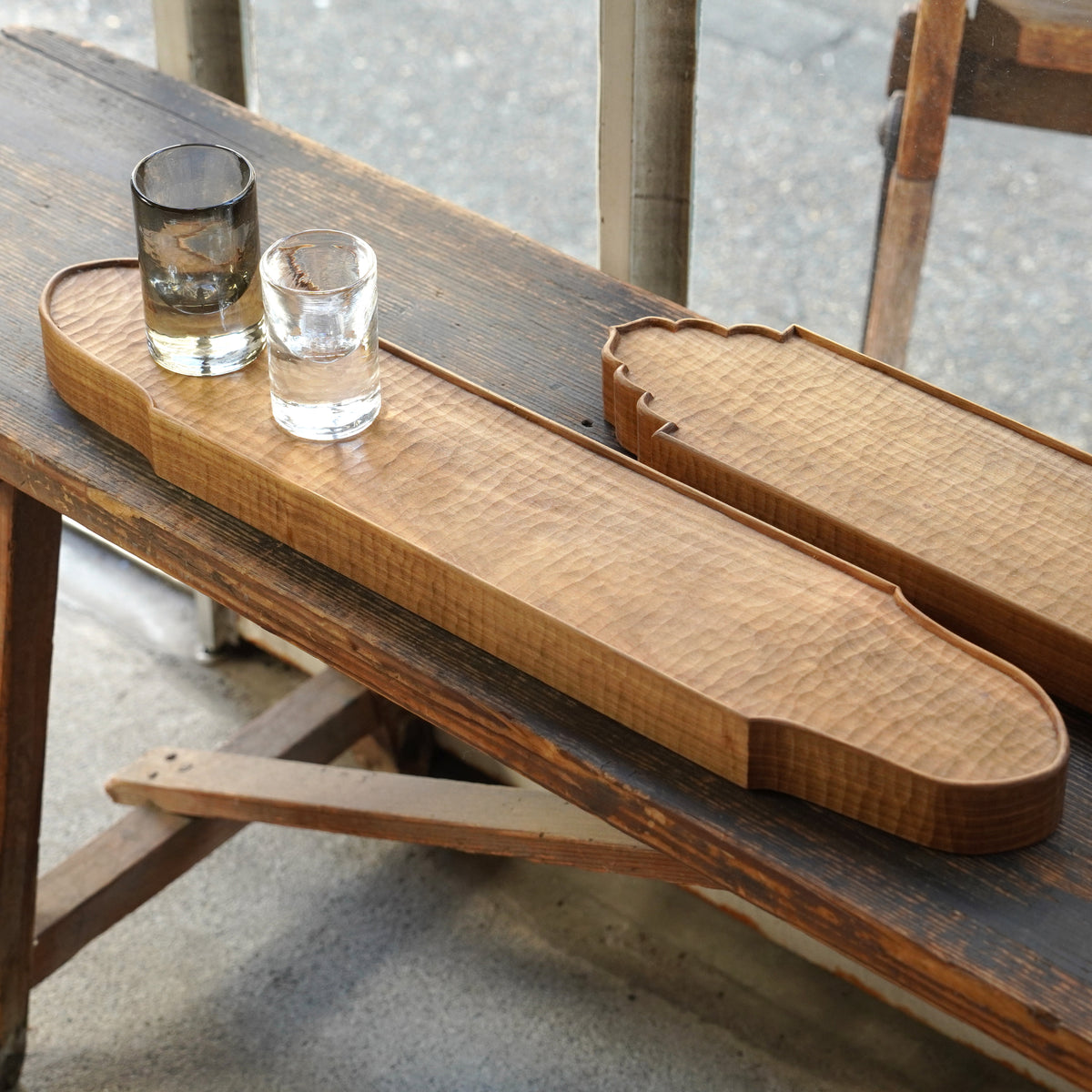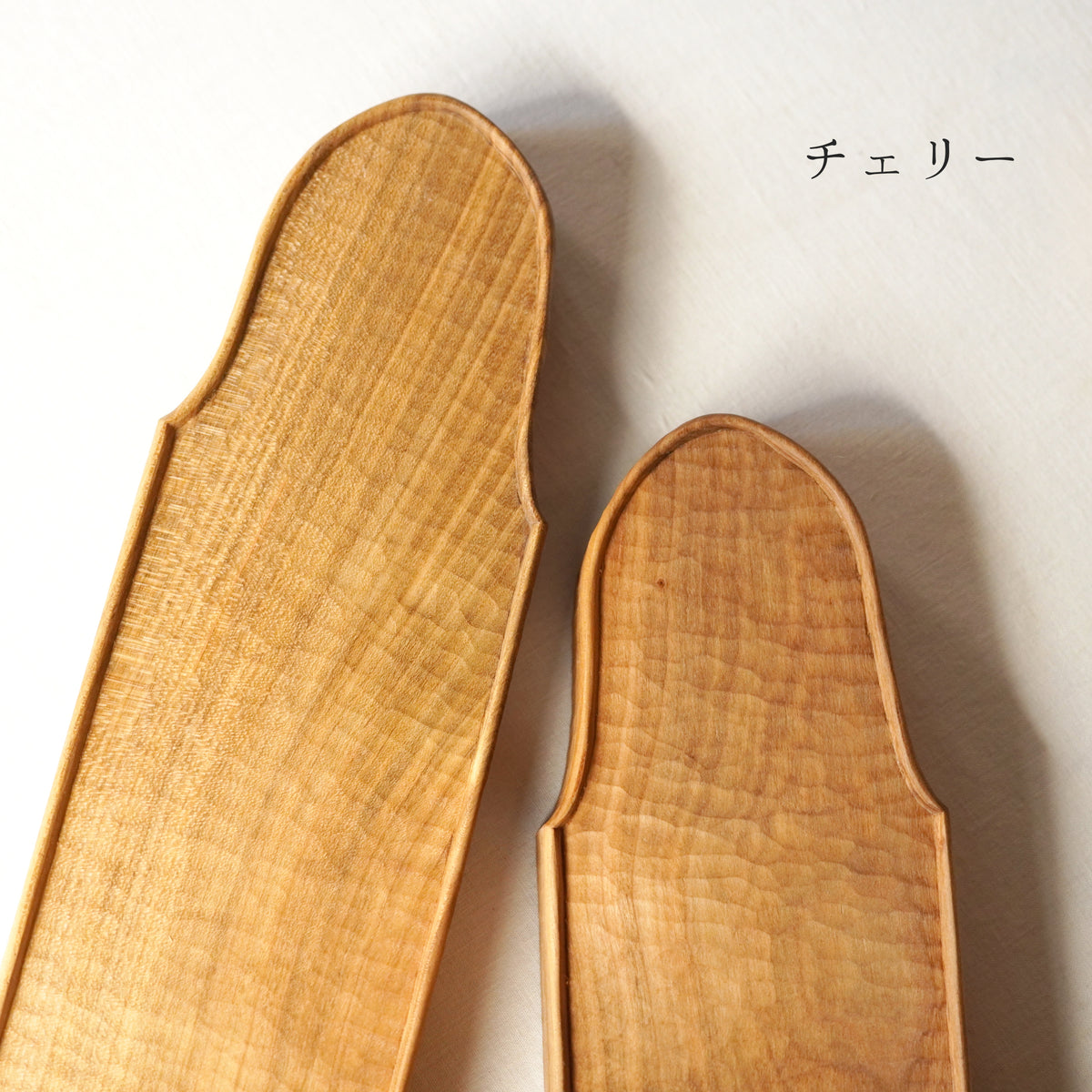 明るいサクラの木目の表情に、細やかな彫り跡がなんとも美しいです。