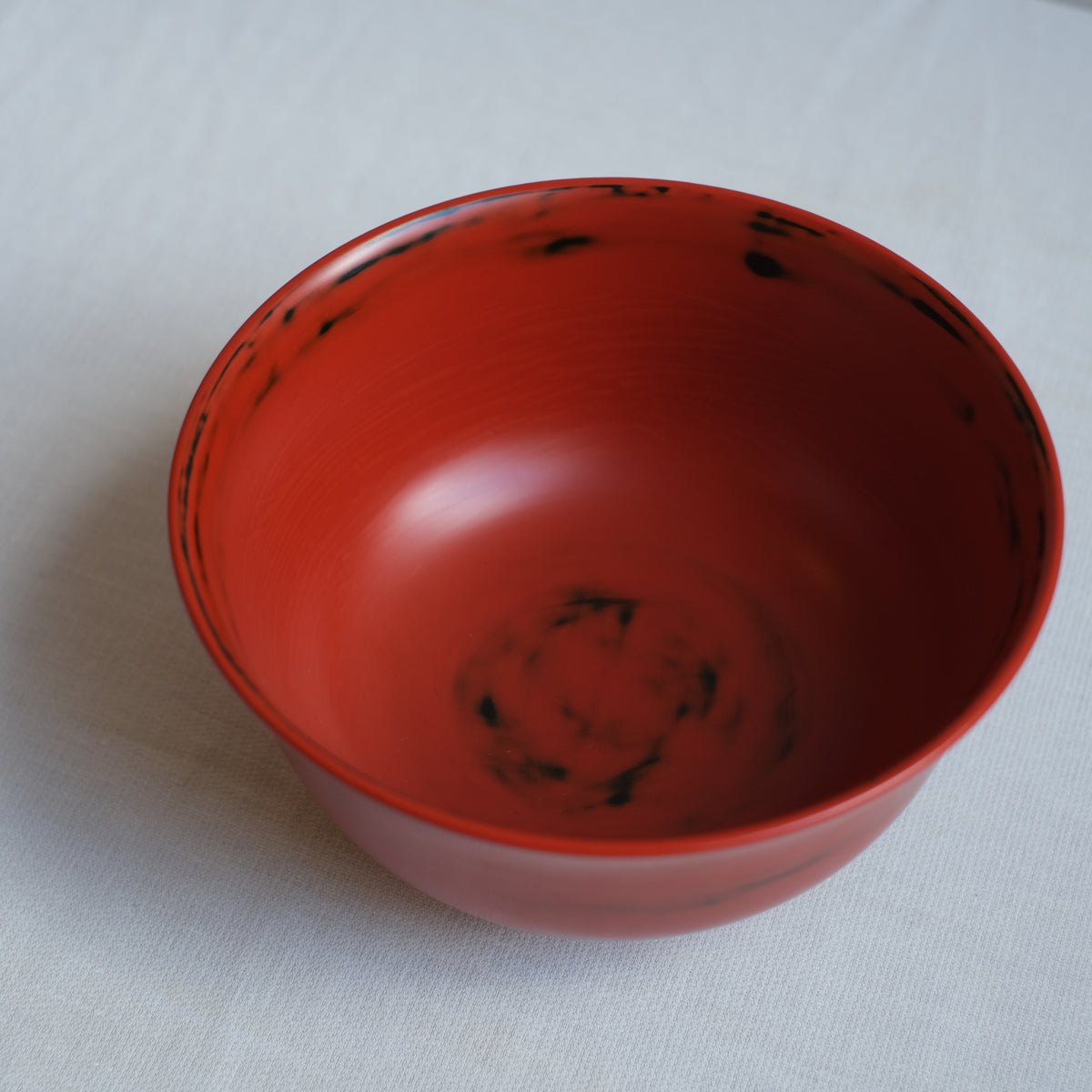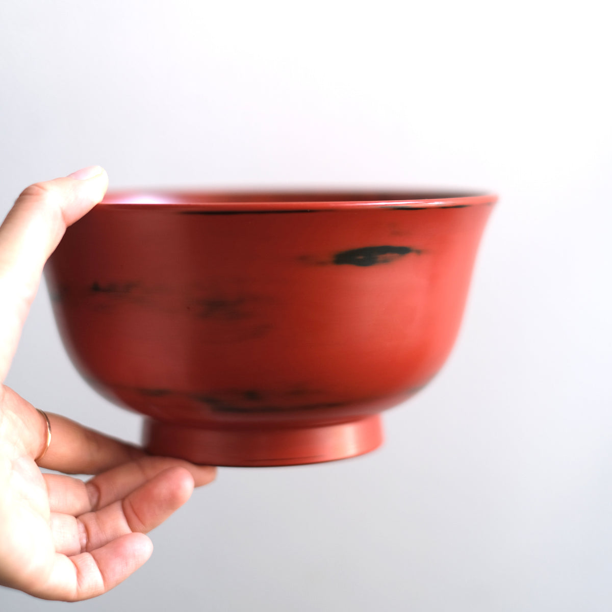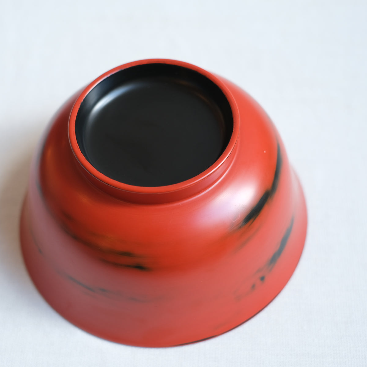 定番の5.5寸丼に古代根来の明るい根来を使用し、下地の黒を出した丼ぶり。