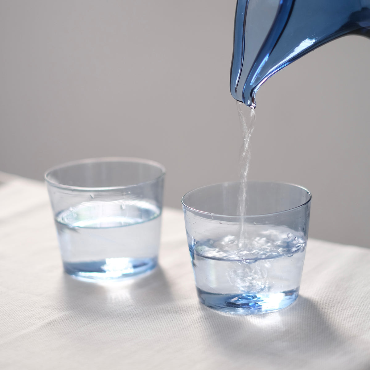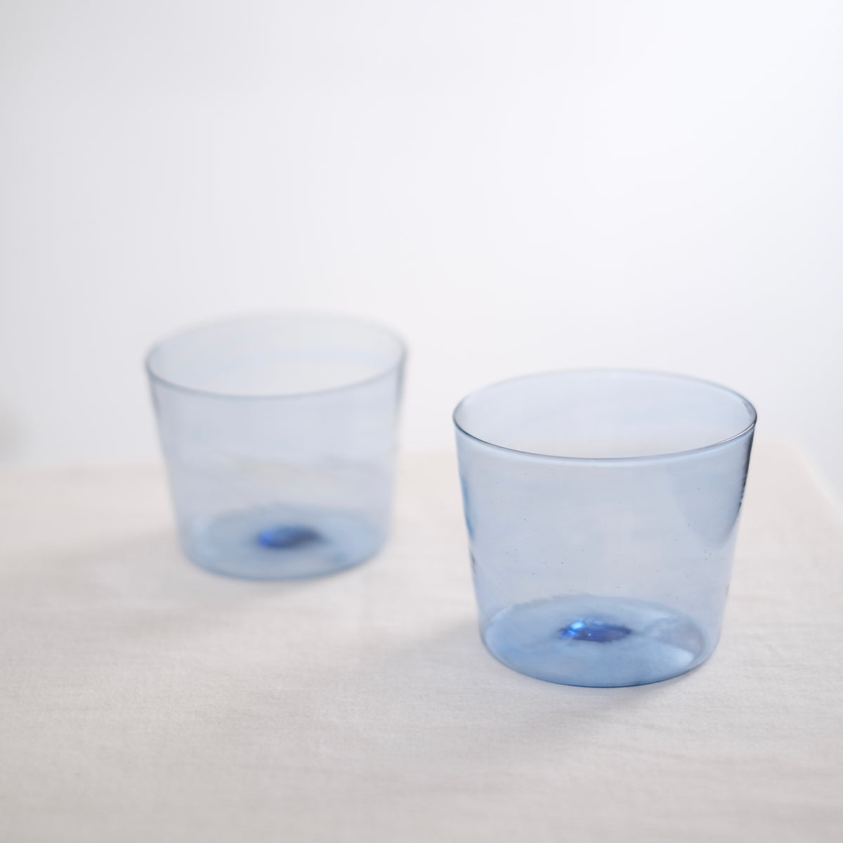 大阪堺市生まれ。現在は石川県能登島で制作されています。有永さんの工房で調合されたガラスは角度により青みや紫を感じ自然光と照明、飲み物の色によっても変化し瞬間の美しさに魅了されます。
